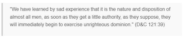 "Unrighteous dominion" is the core warning of D&C 121 (verse 39). Simply put, it means exercising power, authority, or influence over others in an unfair, coercive, or controlling way—using a position to force obedience rather than inspire it.