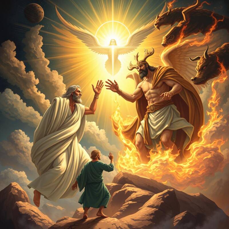 Moses' struggle with vision and Satan illustrates spiritual strife and heavenly enablement. After viewing God's grandeur and handiwork, Moses is alone and scared, trembling. Satan exploits this vulnerability to rule and deceive. Moses faces the enemy with authority, strengthened by God's Spirit. His words, "In the name of the Only Begotten, depart hence, Satan," invoke Jesus Christ's divine power to punish wickedness. Spiritual victory shakes the ground, and Satan flees. This religious symbol stresses that Jesus Christ rules all darkness and that divine might empowers positive action against evil. Spiritual opposition can be overcome with humility, faith, and God's power.